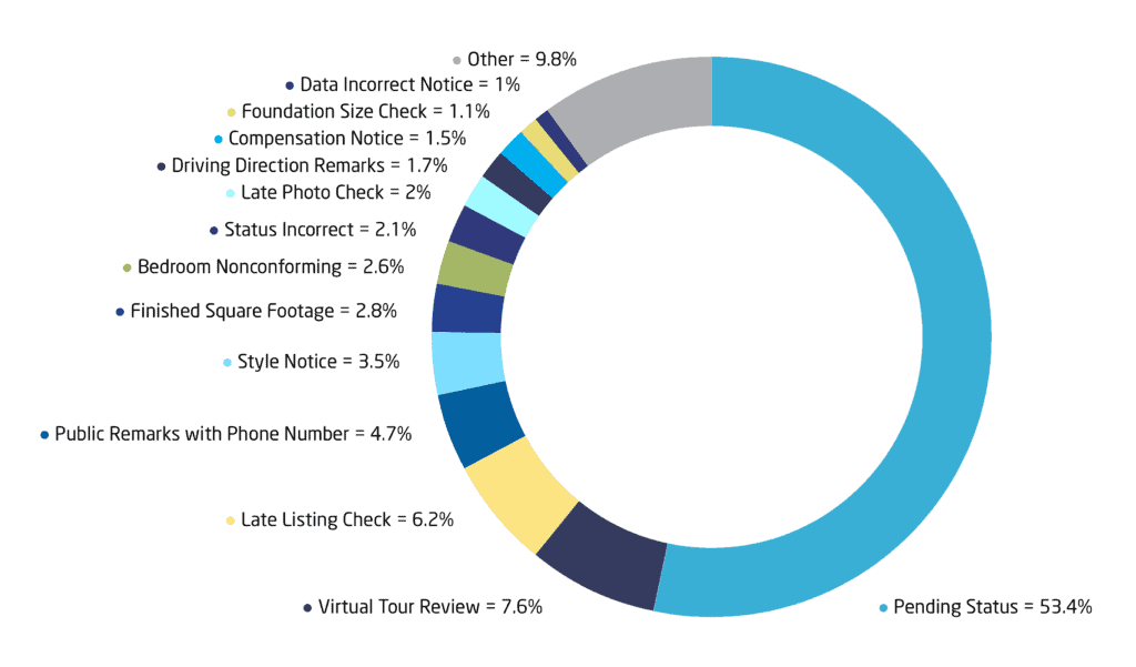 Media-related issues also remained common. In addition to Virtual Tour Review notices, Photo Violations (96), Photo Caption Check (59), and Photo Copying (16) reinforce the importance of ensuring listing media accurately represents the property and complies with MLS rules.